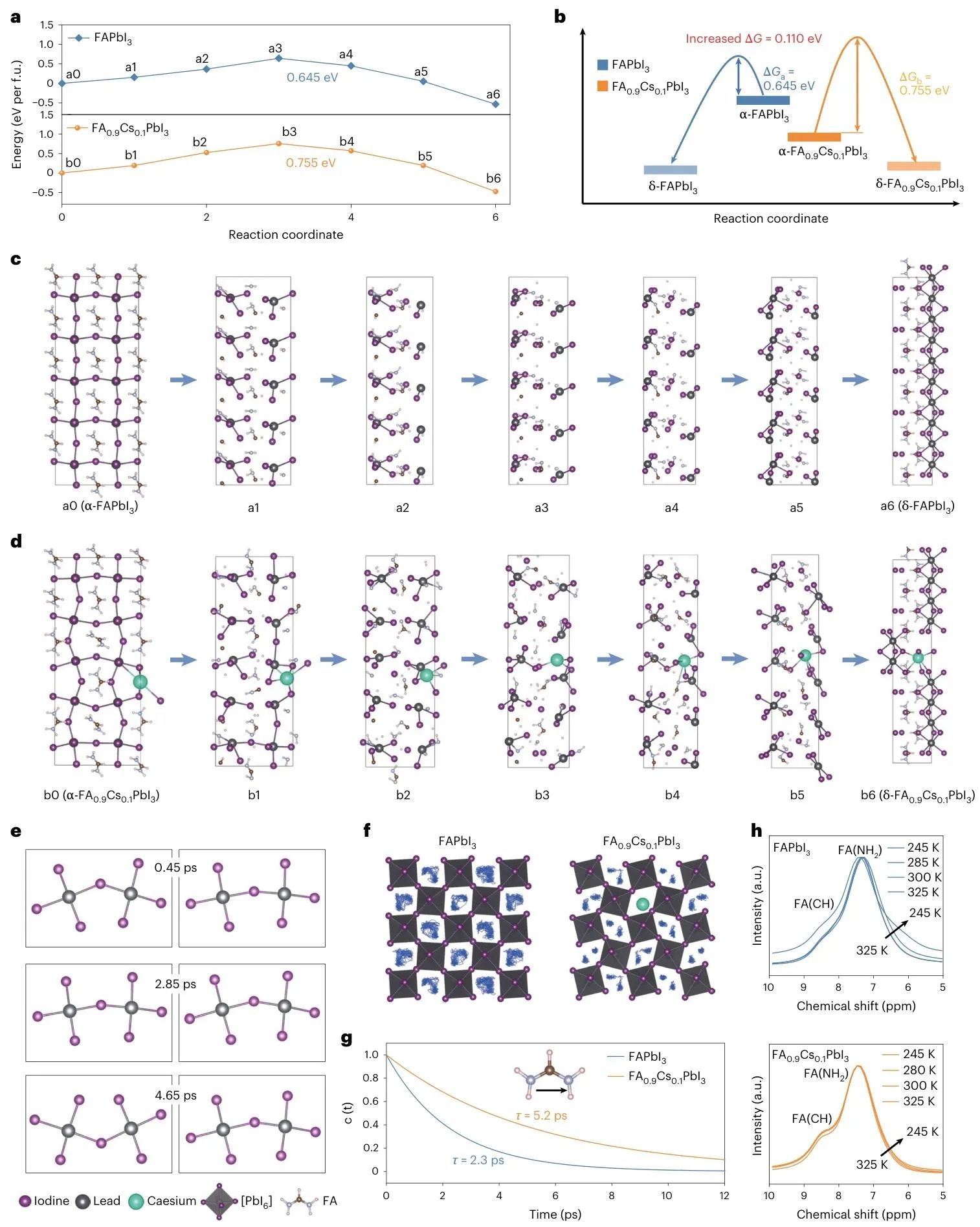 甲脒–铯基金属卤化物钙钛矿凭借可精准调控的晶体生长特性,在两步法制备高效太阳电池中展现出显著优势。然而,受限于铯离子可控掺杂量不足、相变机制尚不清晰,稳定获取器件所需的理想α相仍面临严峻挑战。针对这一关键瓶颈,研究团队创新性设计并合成4-(二苯基膦基)苯甲酸铯,通过有机铯盐精准调控Cs⁺掺入,实现高效掺杂与阳离子均匀分布,成功制备出高相稳定性的高质量钙钛矿薄膜。基于该策略,器件光电转换效率达26.91%,经权威认证效率为26.61%。在最大功率点跟踪与85℃高温(ISOS-L-2)测试条件下,搭配热稳定电荷传输层的器件,在1个太阳光照下连续运行1500小时后,仍可保持初始效率的95%,展现出优异的工作稳定性。该研究系统阐明了FA0.9Cs0.1PbI3的相变路径与过渡态结构,揭示了Cs⁺驱动的钙钛矿晶格稳定机制,为发展高稳定、高效率甲脒–铯基钙钛矿光伏器件提供了重要科学依据与技术路线。