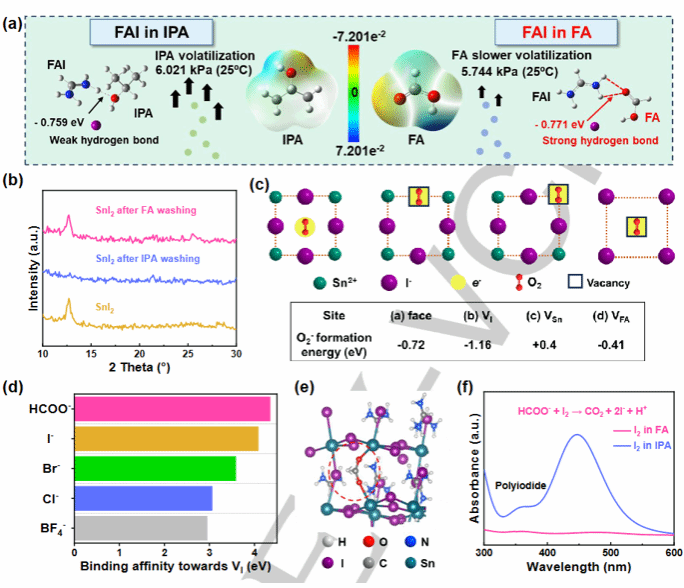 两步沉积方法有效地减轻了在锡基钙钛矿太阳能电池(TPVSC)中观察到的效率下降,随着电池面积的增加,这源于薄膜的不均匀性。然而,SnI2在常规使用的溶剂异丙醇中的高溶解度,加上缺乏对反应扩散过程的有效调节,导致薄膜覆盖和转化率不足。在本研究中,南昌大学陈义旺等人引入甲酸作为第二步溶剂,并引入二硫苏糖醇(DTT)来精心调节反应扩散/结晶动力学。此外,本研究强调了一个基本原理,即配体和 Sn2+ 之间合适的结合能范围为 -1.38 至 -10.10 kcal/mol 可显著提高两步结晶控制的有效性。值得注意的是,在大规模衬底上实现了均匀的钙钛矿薄膜,用 DTT 加工的 TPVSCs 在两步顺序沉积法中表现出 12.68%( 0.04 cm2) 器件和 11.30%( 1 cm2) 的锡基钙钛矿器件的效率,即使在没有二甲基亚砜的情况下也是如此。这项研究为无铅钙钛矿太阳能电池的潜在规模化开发奠定了基础。
