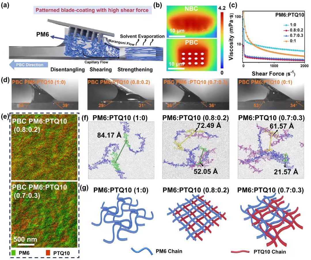 图案化刮涂的流体动力学模拟显示,与普通刮涂相比,图案化刮刀能够使流体在受限空间内挤出,增强定向剪切能力,使马兰戈尼流和毛细管流沿印刷方向协同竞争,从而实现聚合物碎片的有效拉伸和有序堆积。大面积薄膜的UV-vis吸收光谱 mapping证实,PBC薄膜具有优异的均匀性。流变学测试表明,引入PTQ10后溶液粘度降低,剪切极限下降,使溶质在较小剪切力下即可发生滑移。高速相机图像显示,PM6:PTQ10(0.8:0.2)溶液具有更小的弯月面接触角,表明PTQ10有效降低了溶液剪切极限,有利于聚合物链充分拉伸。